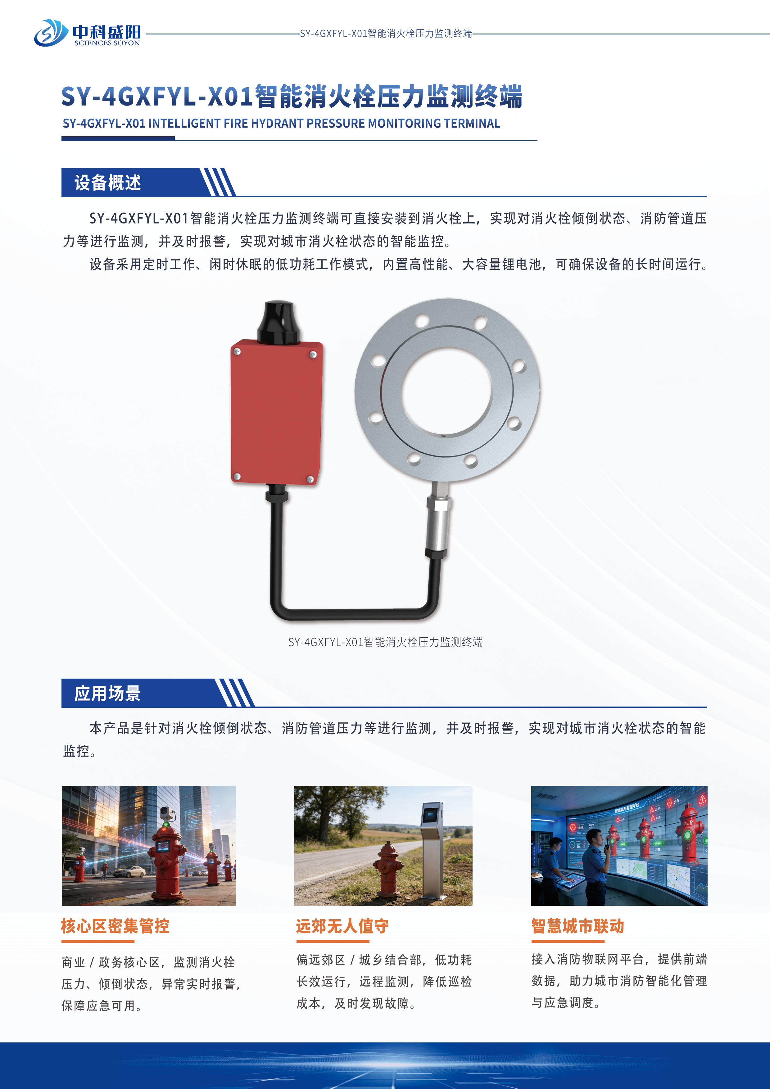 SY-4GXFYL-X01智能消火栓压力监测终端可直接安装到消火栓上,实现对消火栓倾倒状态、消防管道压力等进行监测,并及时报警,实现对城市消火栓状态的智能监控。设备采用定时工作、闲时休眠的低功耗工作模式,内置高性能、大容量锂电池,可确保设备的长时间运行。