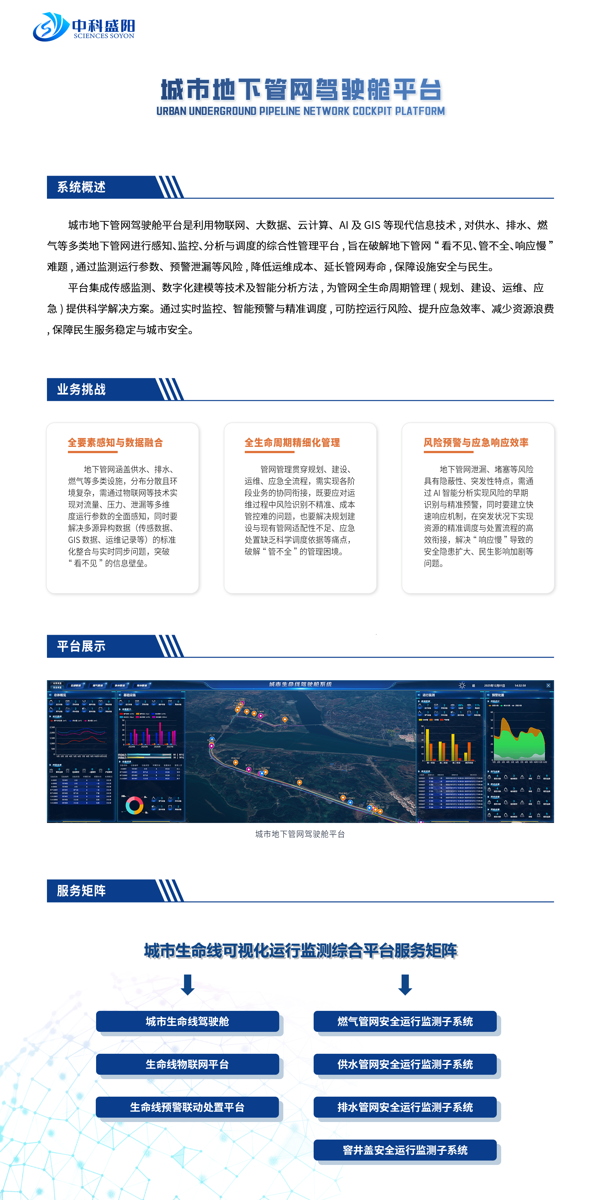 对供水、排水、燃 气等多类地下管网进行感知、监控、分析与调度的综合性管理平台,旨在破解地下管网“看不见、管不全、响应慢” 难题,通过监测运行参数、预警泄漏等风险