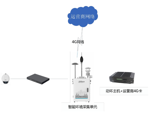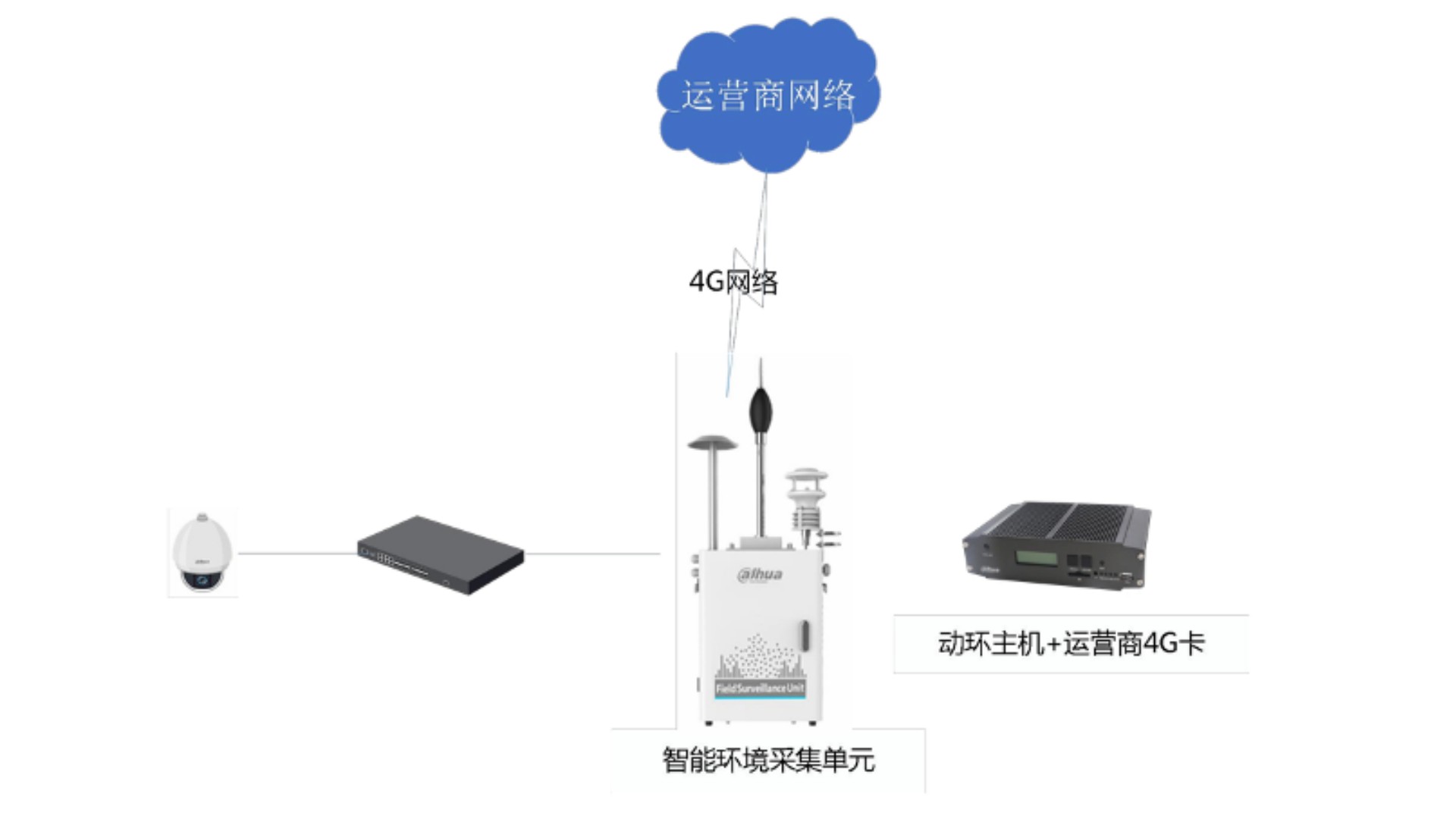 通过智能环保采集单元,配置运营商的 4G 卡,通过 4G 网络传输至中心进行预览、存储。