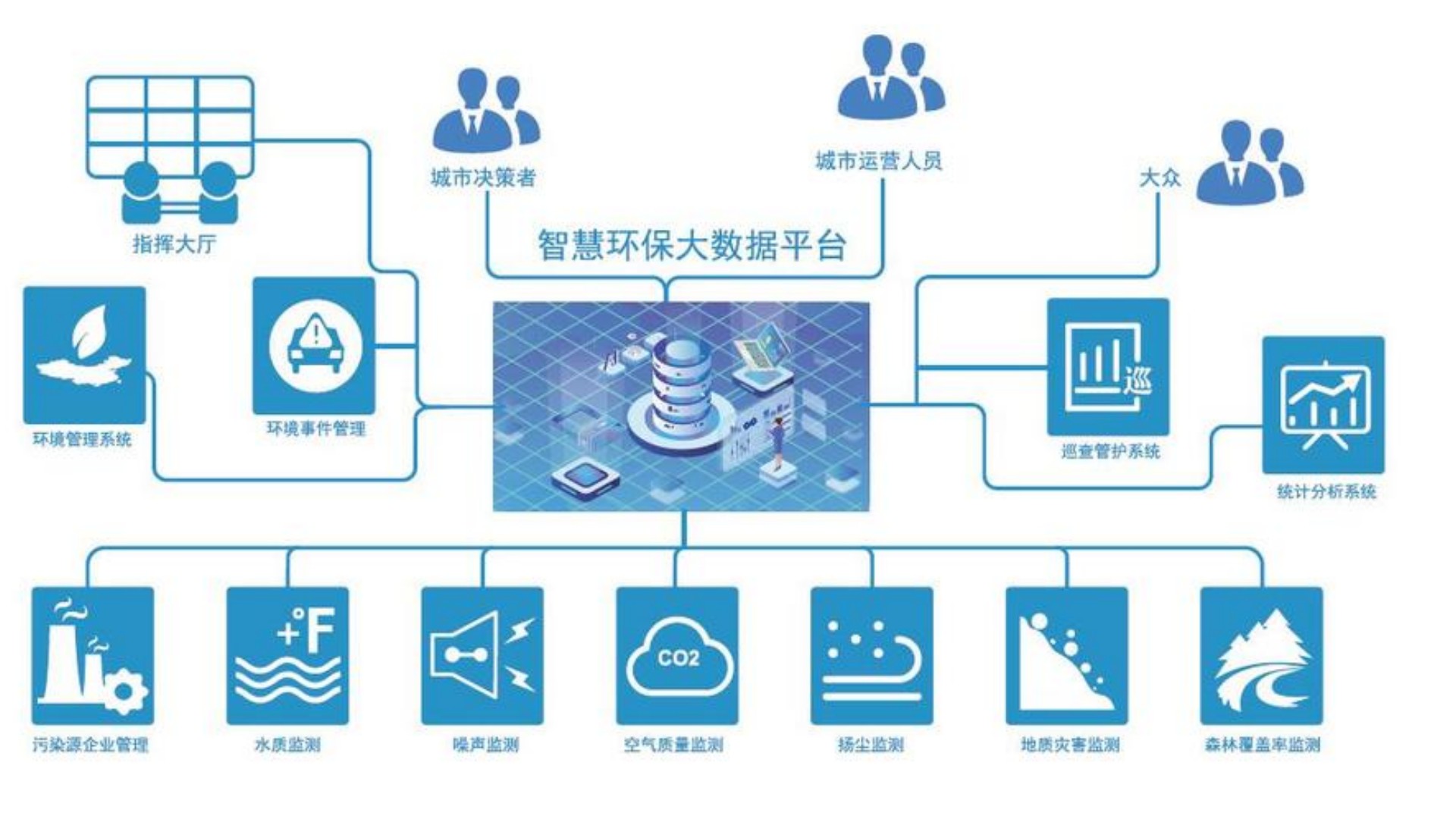 智慧环保监测系统由数据采集、传输、存储、显示、控制及应用五大模块组成。