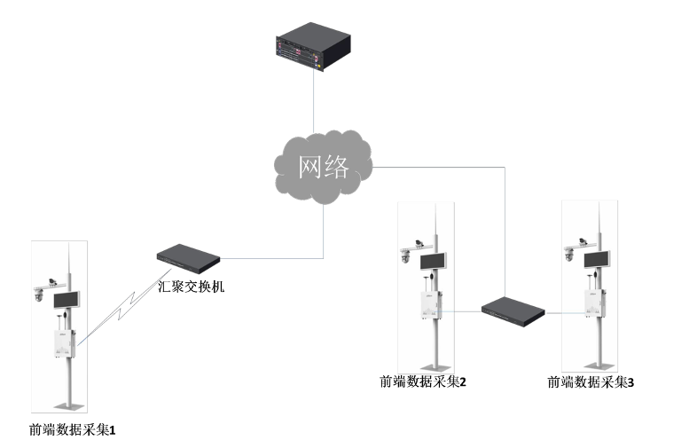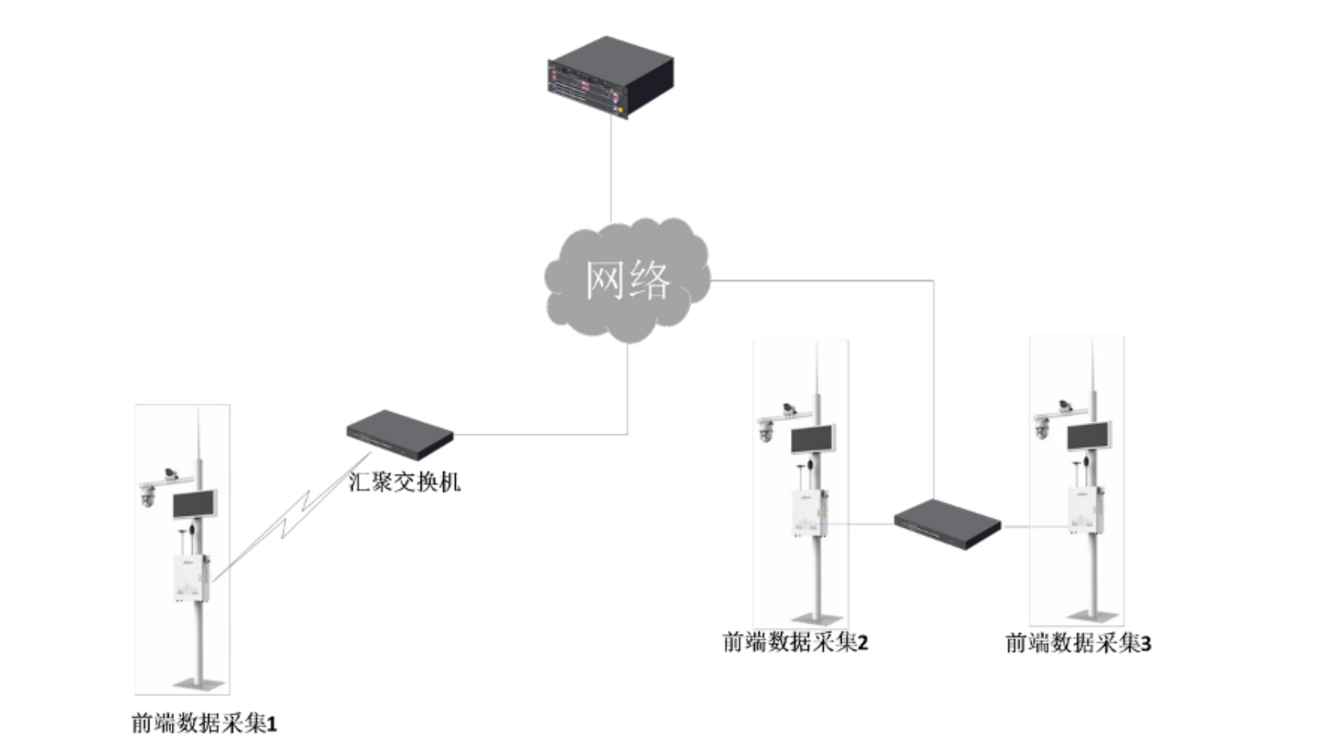 部分智能环保采集单元和本地汇聚交换机之间,可以通过 5.8G 无线传输设备进行无线传输,工地汇聚交换机与中心之间通过运营商网络进行传输。