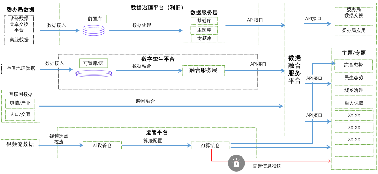 针对结构化数据构建数据资源标准层的建设,通过一组数据工具对所有汇入数据进行数据融合和数据治理,通过数据治理平台进行数据深度加工,通过数据融合服务平台向上层的应用提供各类数据服务。委办局数据和一些离线类数据将经过前置库的归集后通过数据治理平台的治理形成一系列的基础库、主题库、专题库。空间地理数据经前置库归集后在数字孪生平台层进行三维渲染,形成三维组件服务层归口到数据融合服务平台。互联网涉及的人口、交通、产业、舆情等数据也将通过API接口的形式汇聚到数据融合服务平台,由数据融合服务平台把多种数据源的数据进行融合计算分析,输出结果到应用层的各类主题与专题。
