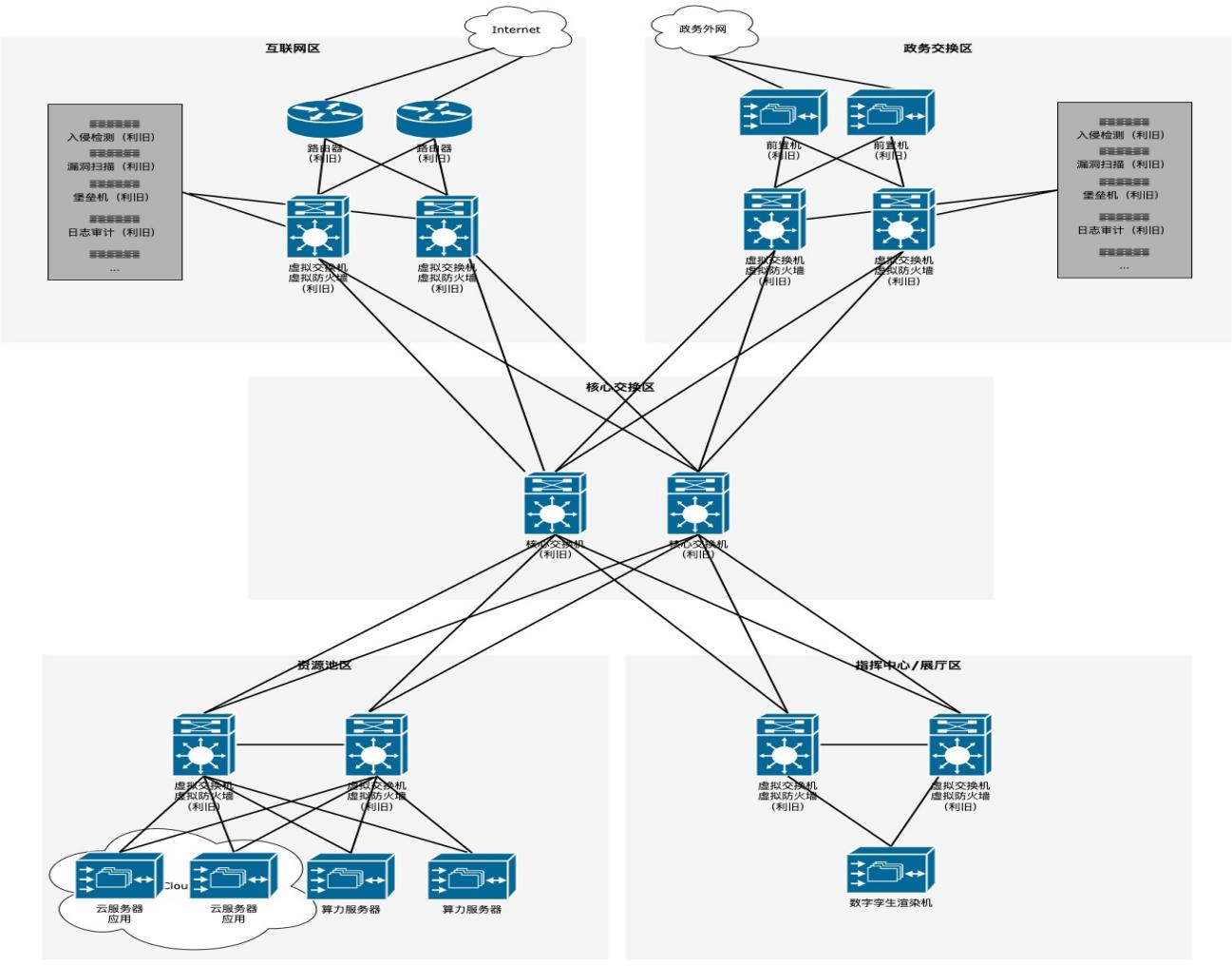 网络的部署环境依赖政务外网现有的核心网络、安全环境,主要在资源池区增补本系统涉及的算力资源、计算、存储资源等,承载数字城市的软件平台与服务,硬件增补融合到现有云资源和算力资源中。在指挥中心/展厅区域中增加数字孪生渲染机用于三维实时渲染,支撑数字孪生效果的呈现。