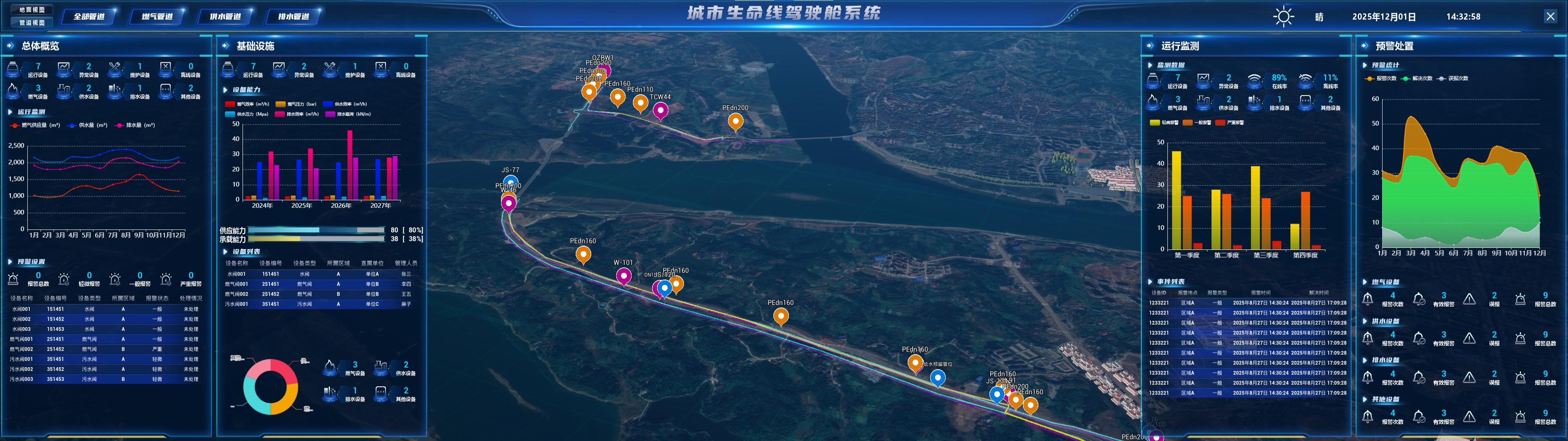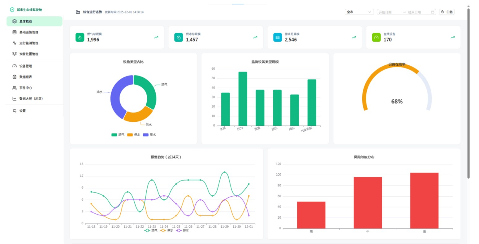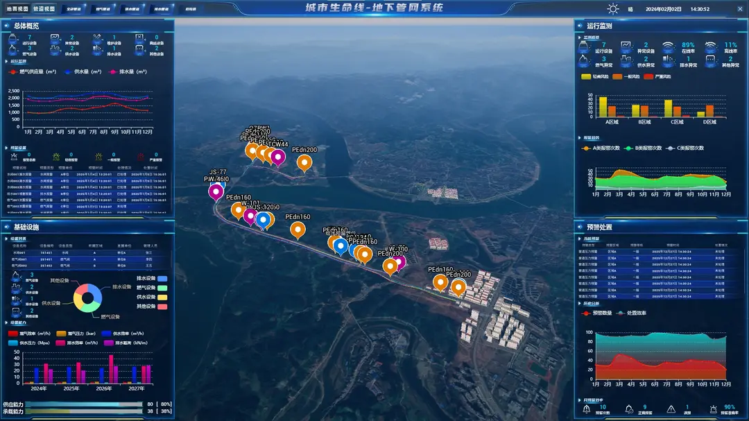 智慧应用:在智能中枢平台层基础上搭建各类业务应用系统,包括城市生命线驾驶舱系统、生命线预警联动处置系统、应急与指挥调度系统、管网设施智能管控系统、移动应用服务系统、燃气管网/供水管网/排水管网/窨井盖安全运行监测系统,以提供一体化的决策、管理和服务工具。